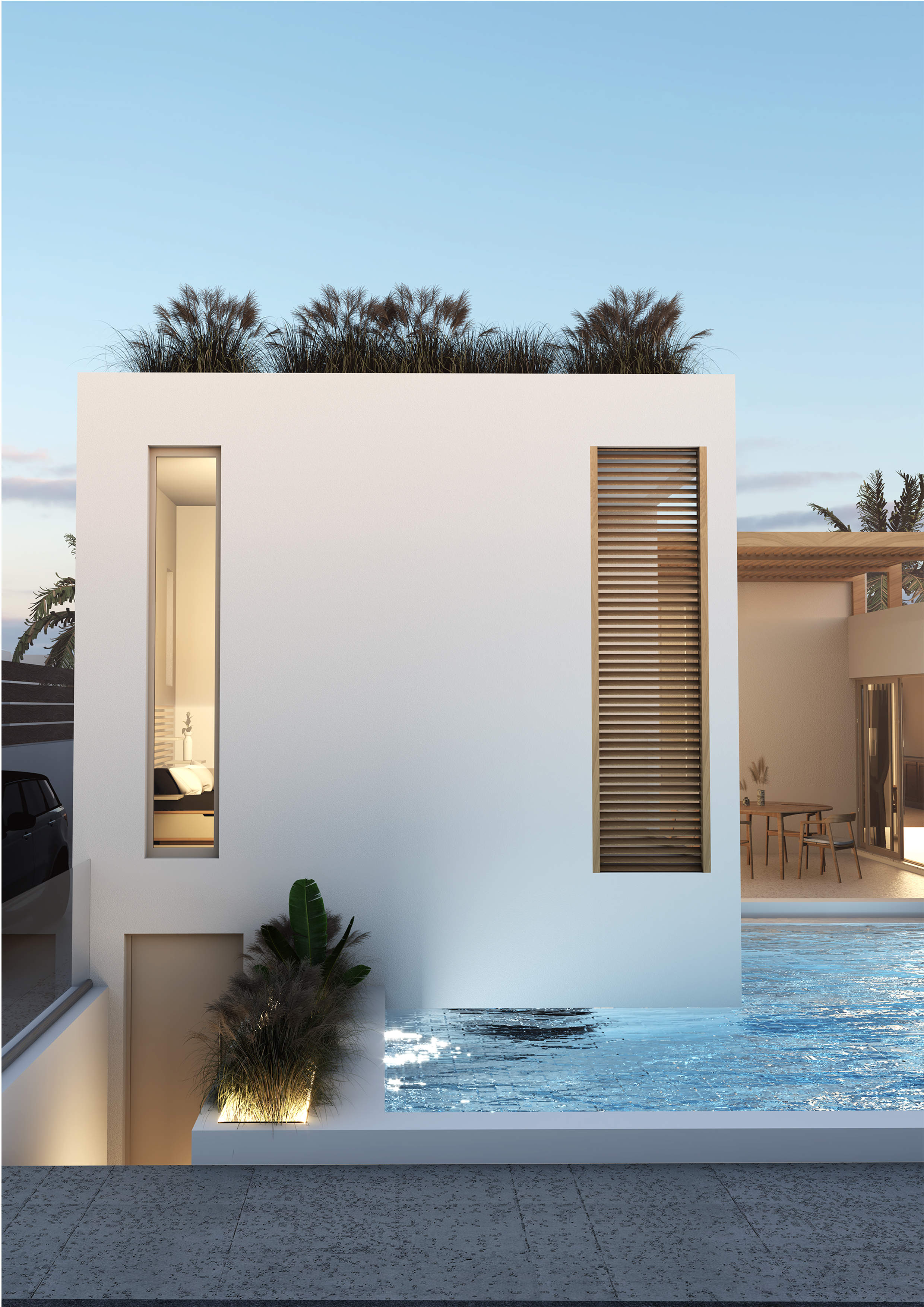 Λόγω της στενότητας του χώρου, έγινε προσπάθεια να εκμεταλλευτεί και ο μικρότερος χώρος του οικοπέδου και μέσω του σχήματος την κάτοψης, να επιτευχθεί ο μέγιστος φωτισμός και αερισμός της οικίας. Ταυτόχρονα η κολυμβητική δεξαμενή αγκαλιάζει τον ένα όγκο του κτιρίου, δίνοντας την αίσθηση ότι επιπλέει.