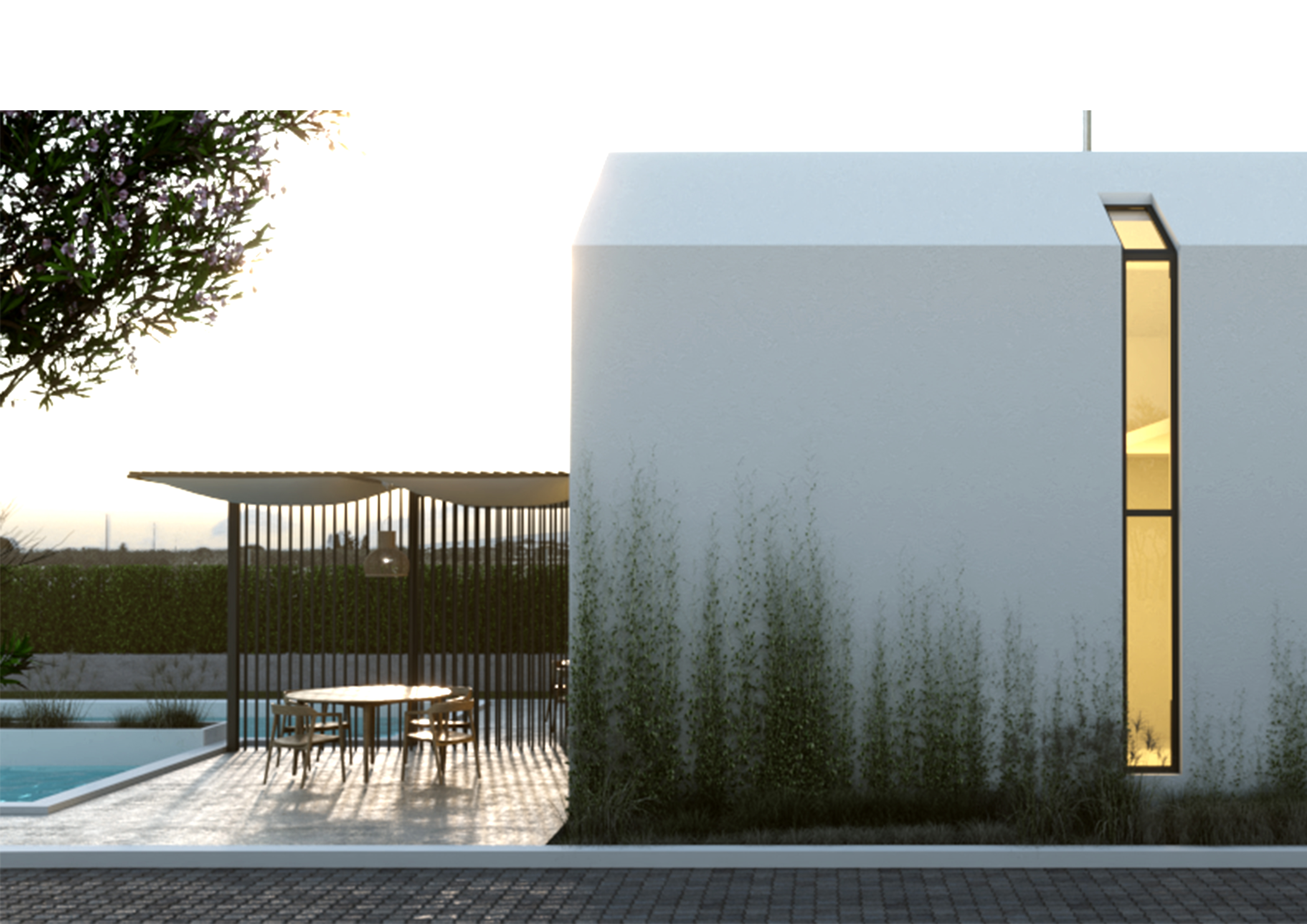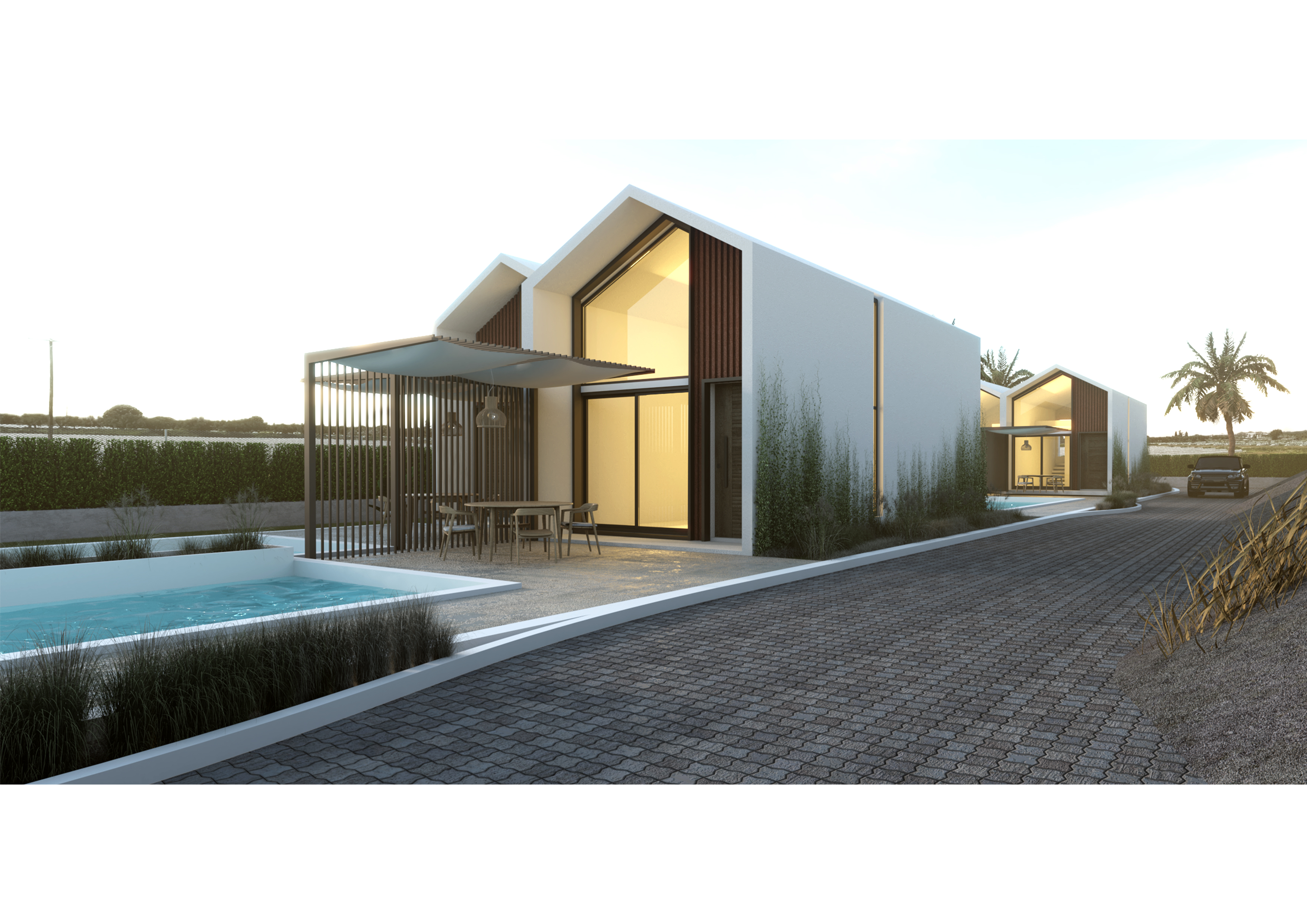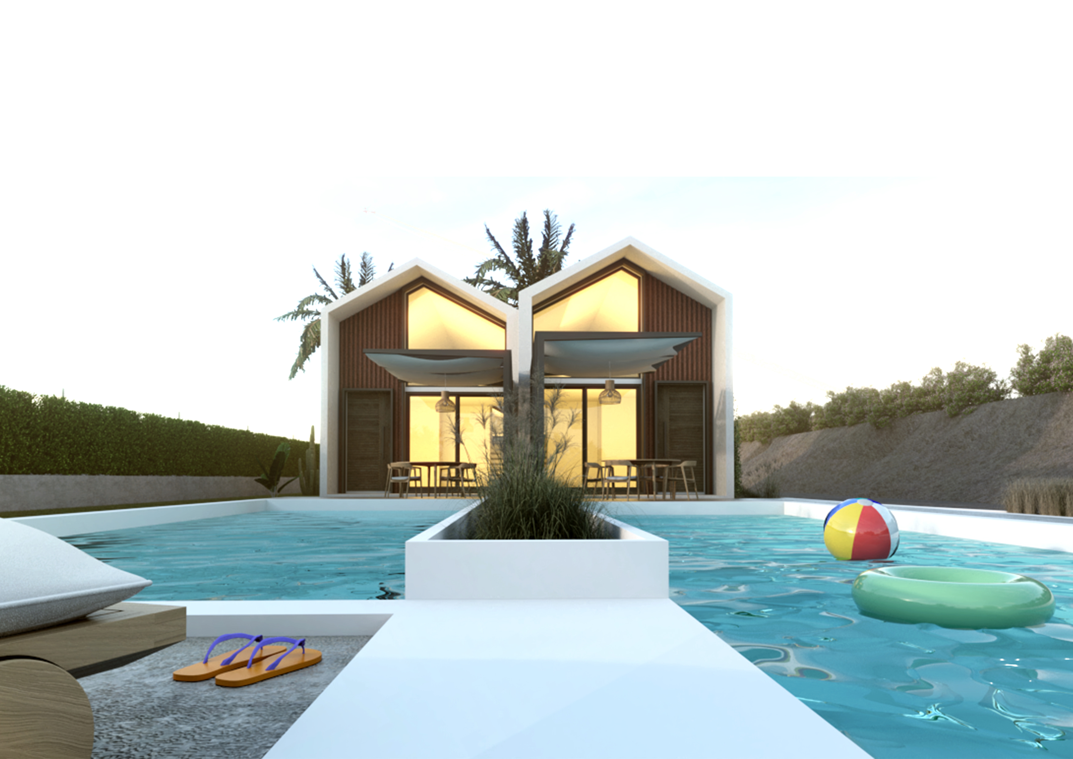 Το έργο βρίσκεται σε τεμάχιο με έντονη υψομετρική διαφορά σε σχέση με το δρόμο που εφάπτεται σε αυτό και έχει θέα στη θάλασσα. Ο σχεδιασμός αφορά την κατασκευή τεσσάρων ισογείων διαμερισμάτων με πατάρι, διαμόρφωση υπαίθριου χώρου και κατασκευή κολυμβητικών δεξαμενών, βάσει των αρχιτεκτονικών διατάξεων και περιορισμών που επιβάλλει η αρχιτεκτονική υπηρεσία της περιοχής.